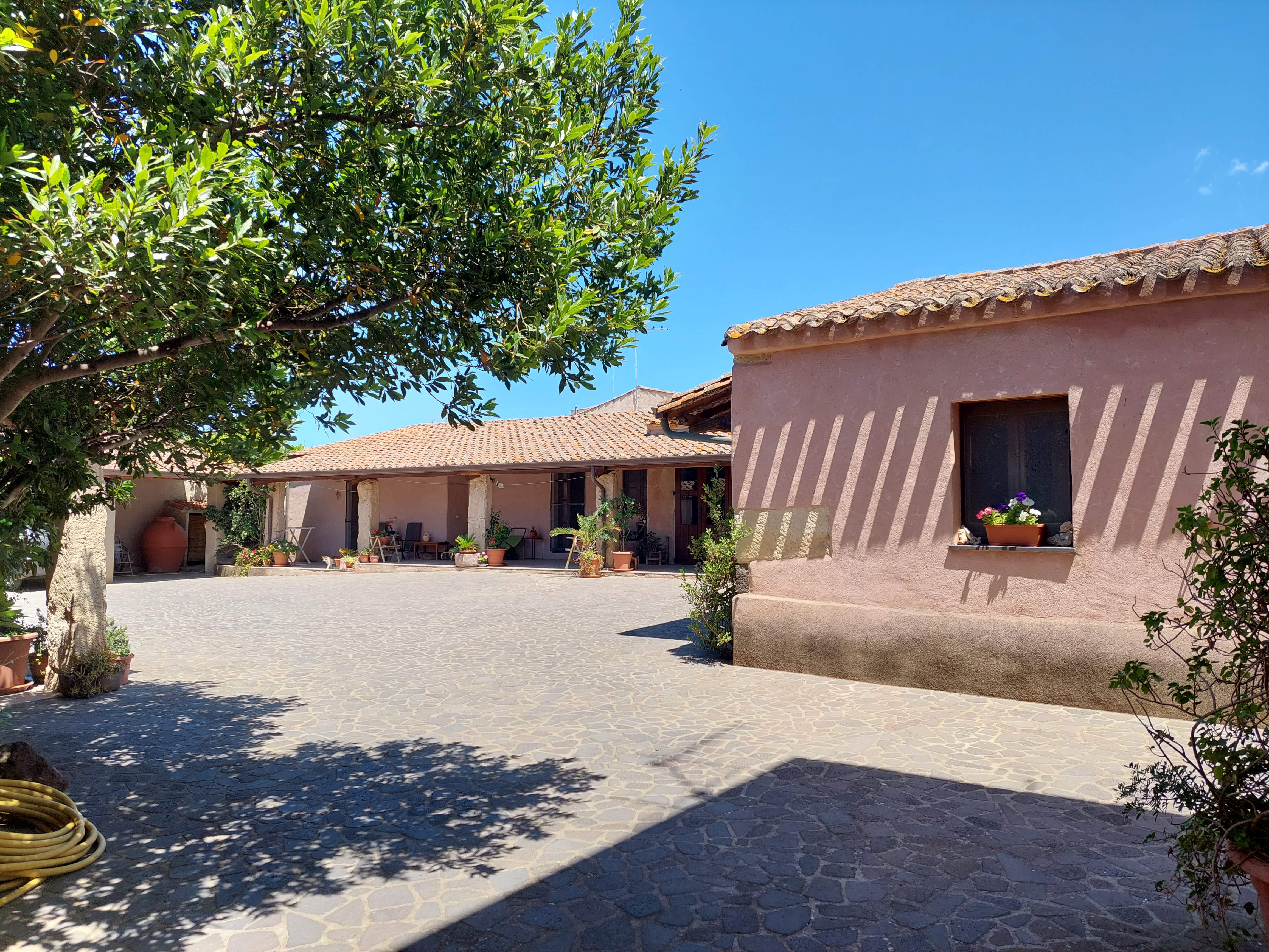 Completamente nascosto alla vista dalla strada, superando il grande portone di ingresso ci si ritrova in un ampio spazio dotato di aree coperte attrezzate, spazio per posteggiare. Splendida nella bella stagione, la corte risulta piacevolissima anche nelle stagioni più fredde per via dell'esposizione e degli spazi coperti e riparati.